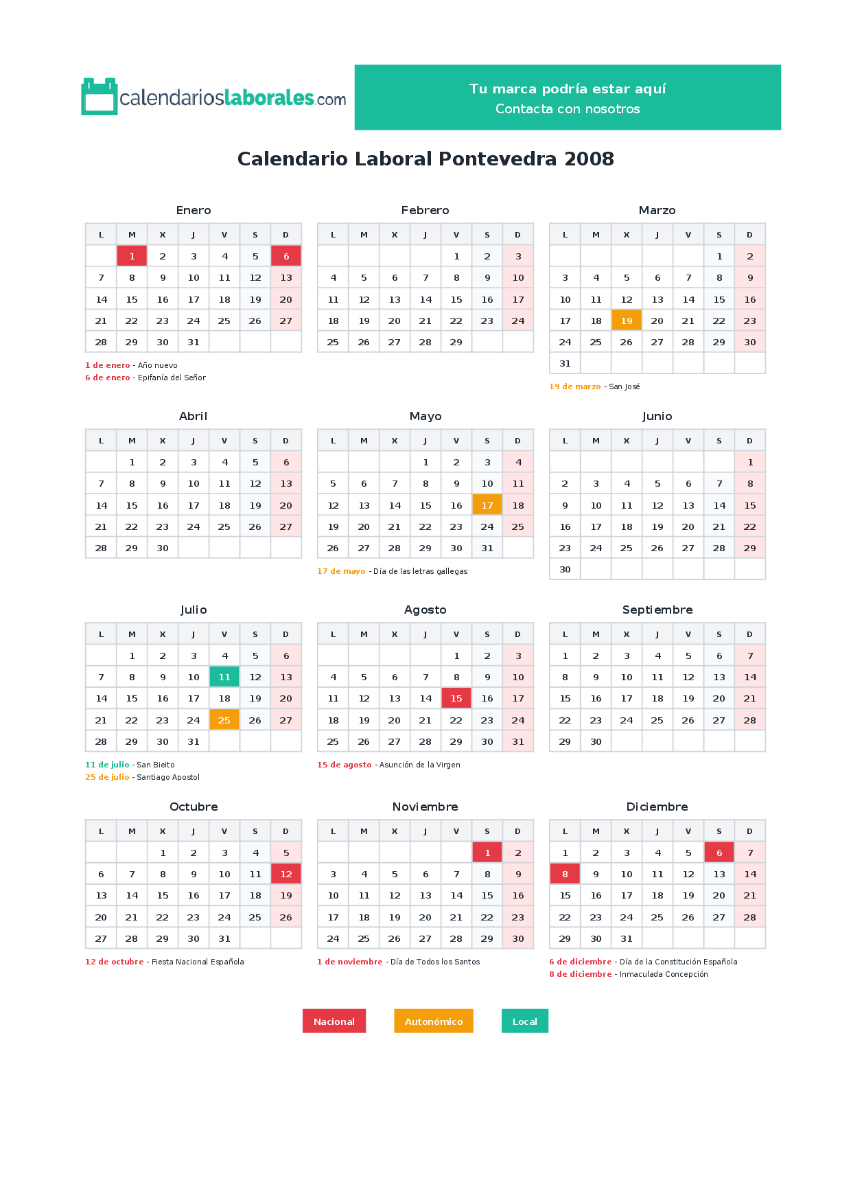 El calendario laboral de Pontevedra en 2008 cuenta con un total de 11 días festivos, que incluyen festivos nacionales, festivos autonómicos de Galicia y los festivos locales establecidos por cada municipio.
