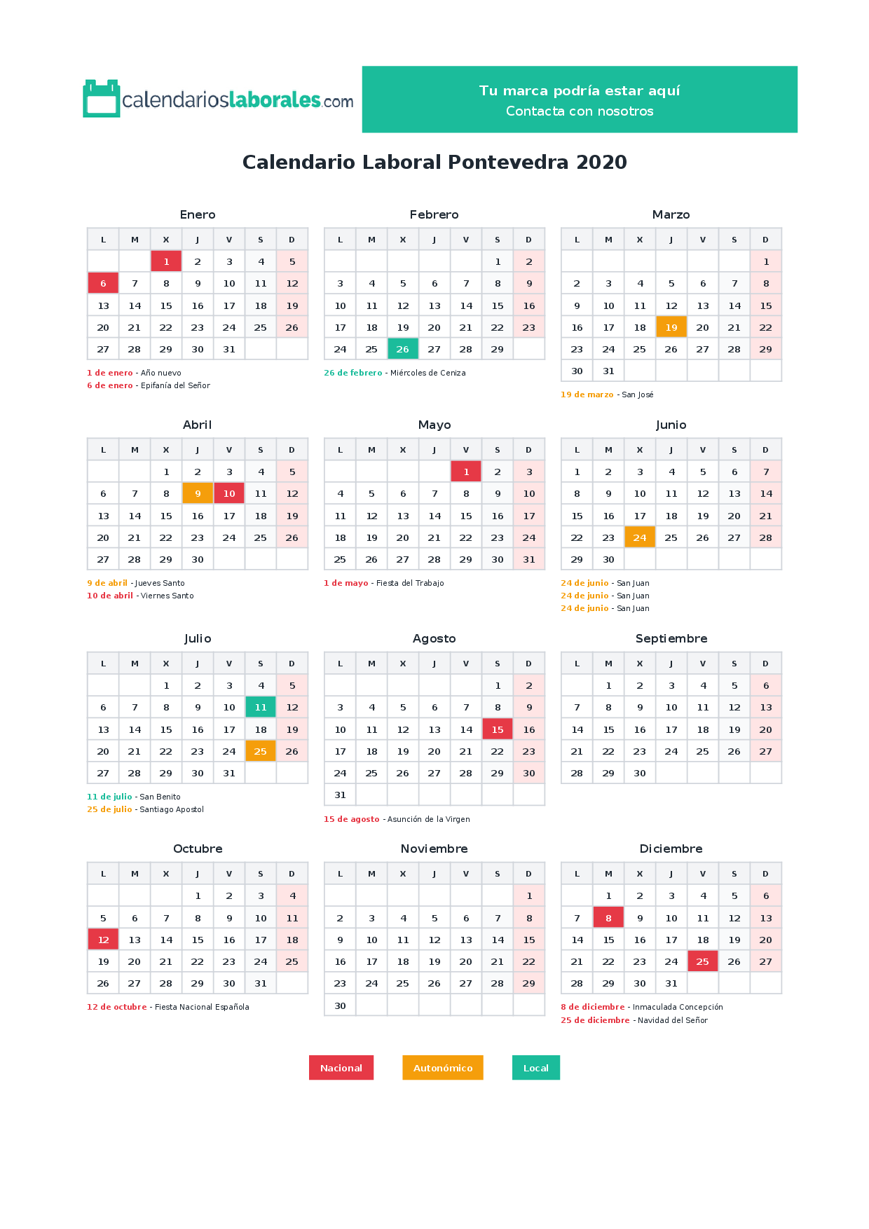 El calendario laboral de Pontevedra en 2020 cuenta con un total de 14 días festivos, que incluyen festivos nacionales, festivos autonómicos de Galicia y los festivos locales establecidos por cada municipio.