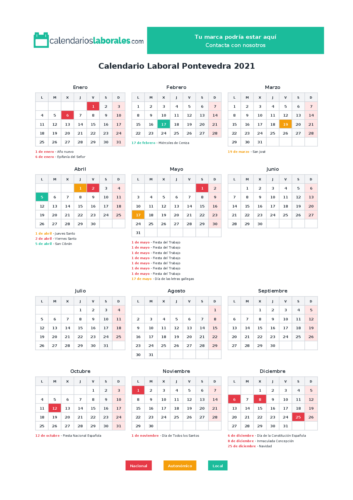 El calendario laboral de Pontevedra en 2021 cuenta con un total de 14 días festivos, que incluyen festivos nacionales, festivos autonómicos de Galicia y los festivos locales establecidos por cada municipio.