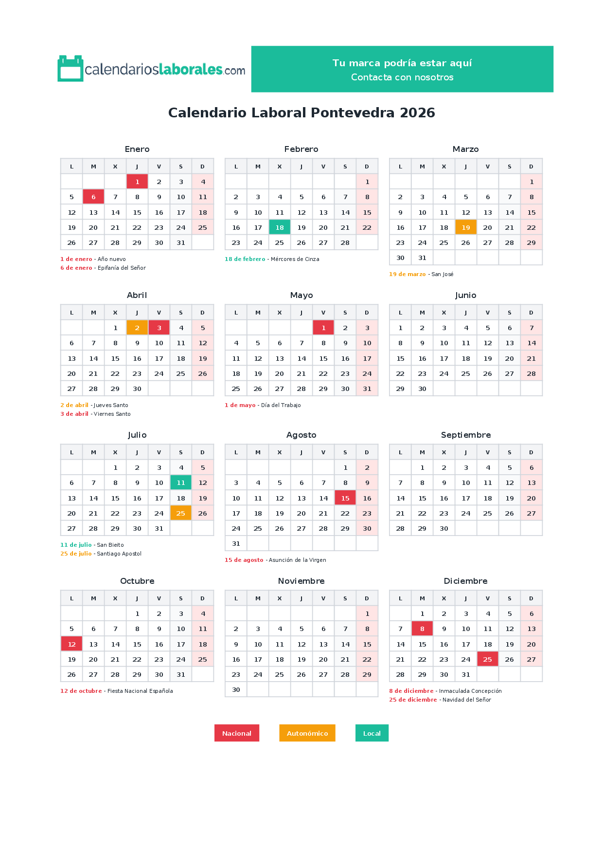 Calendario laboral Pontevedra 2026