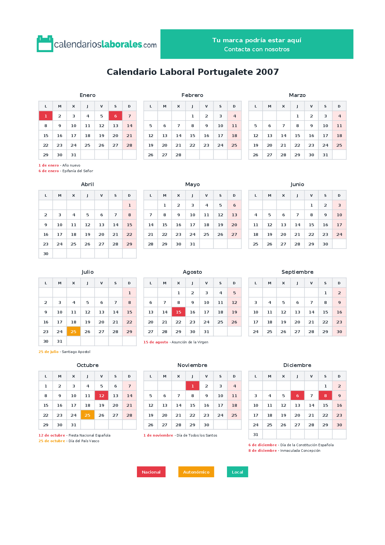 En 2007, 7 festivos nacionales se celebran en todo el territorio español, incluidos en el calendario laboral de Portugalete.