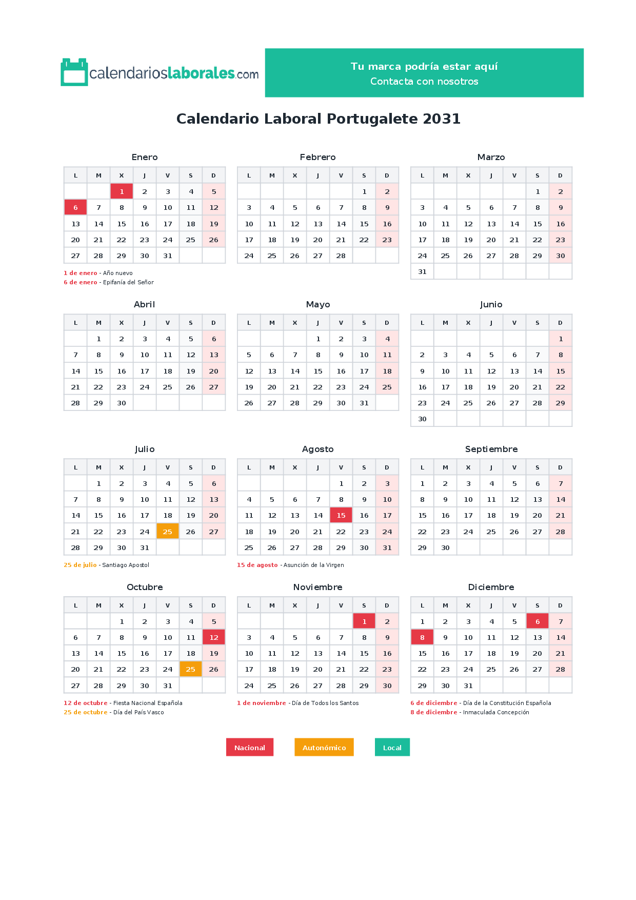 Calendario laboral Portugalete 2031