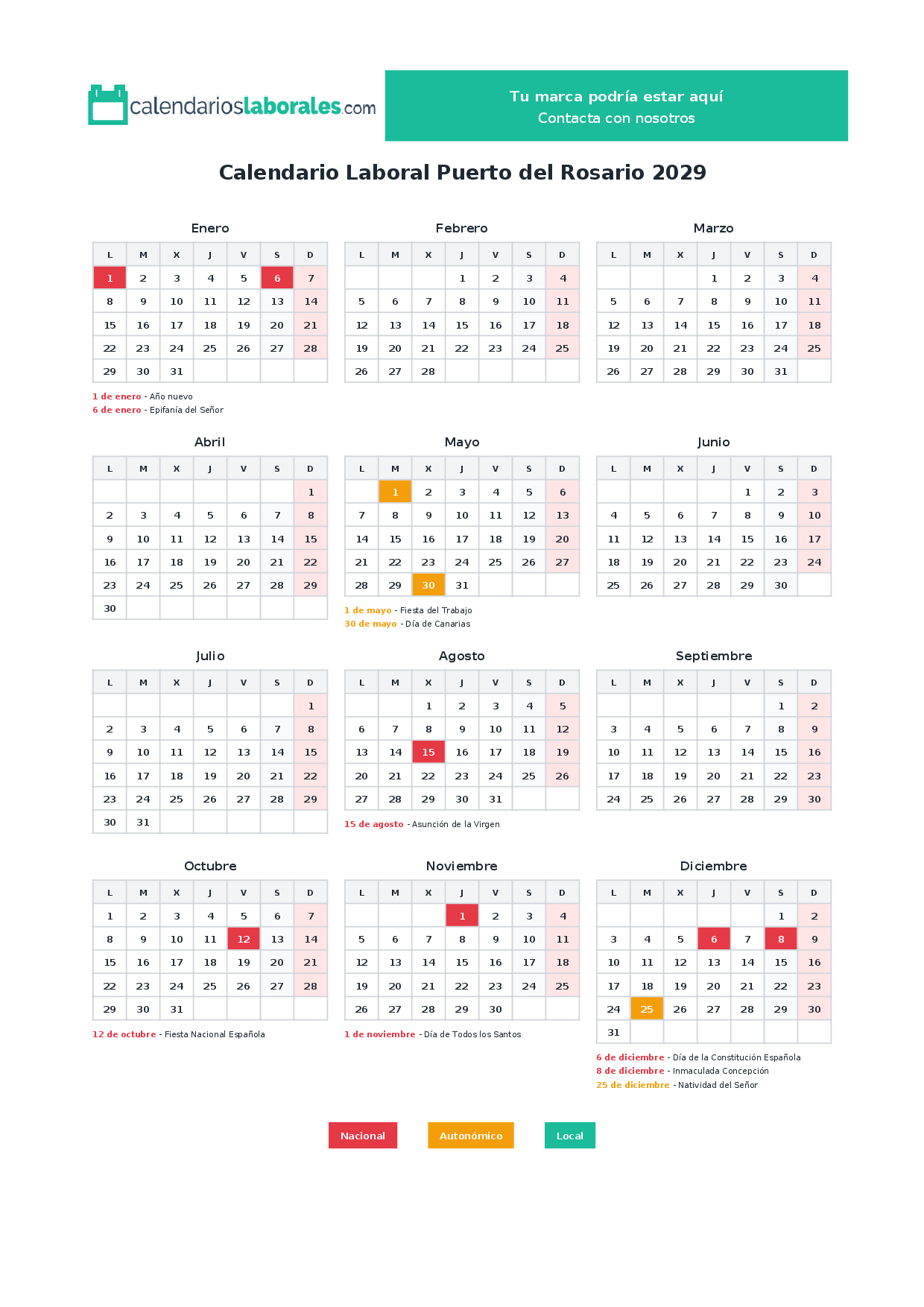 El calendario laboral de Puerto del Rosario en 2029 incluye un total de 10 días festivos, que combinan festivos nacionales, festivos autonómicos de Canarias y los festivos locales propios del municipio.