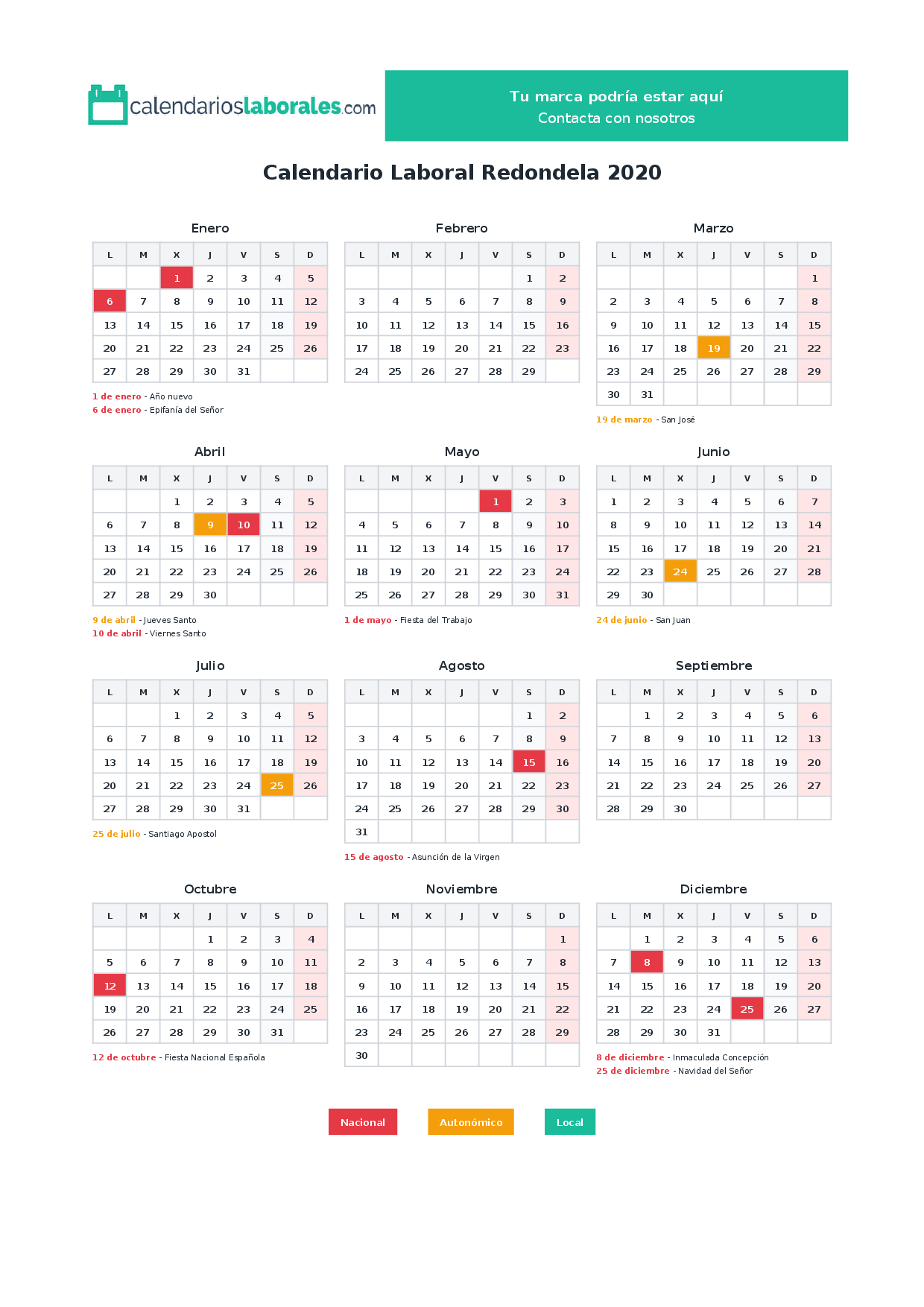 Calendario laboral Redondela 2020