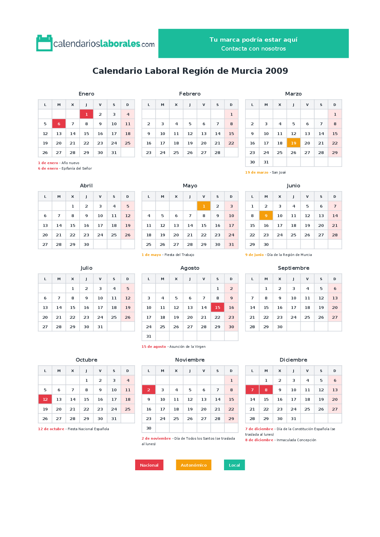 Festivos nacionales en Región de Murcia 2009