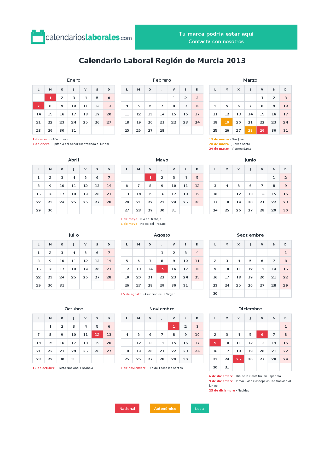 Festivos nacionales en Región de Murcia 2013