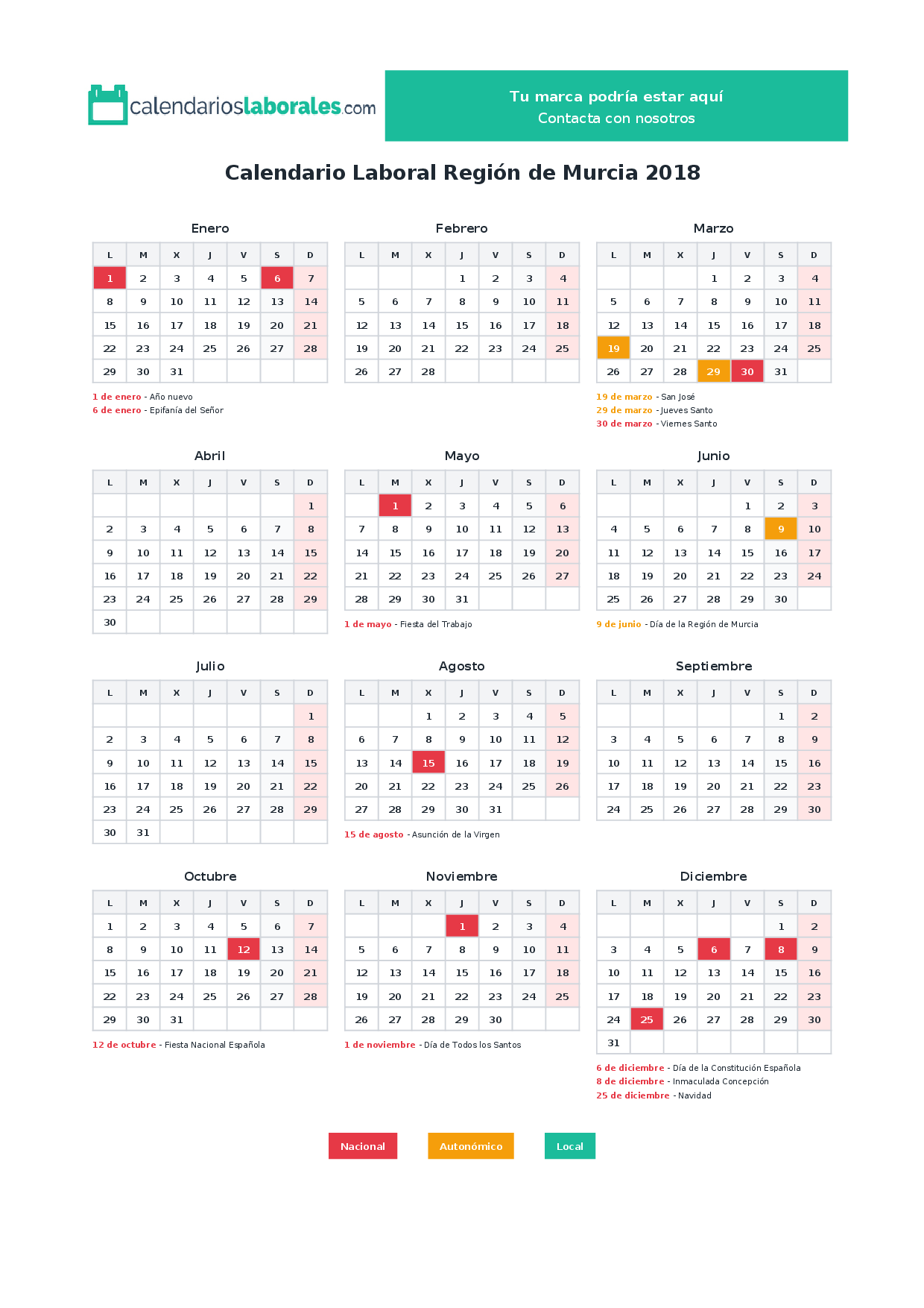 El calendario laboral de Región de Murcia en 2018 incluye un total de 13 días festivos, que combinan festivos nacionales y festivos autonómicos establecidos por la comunidad autónoma.