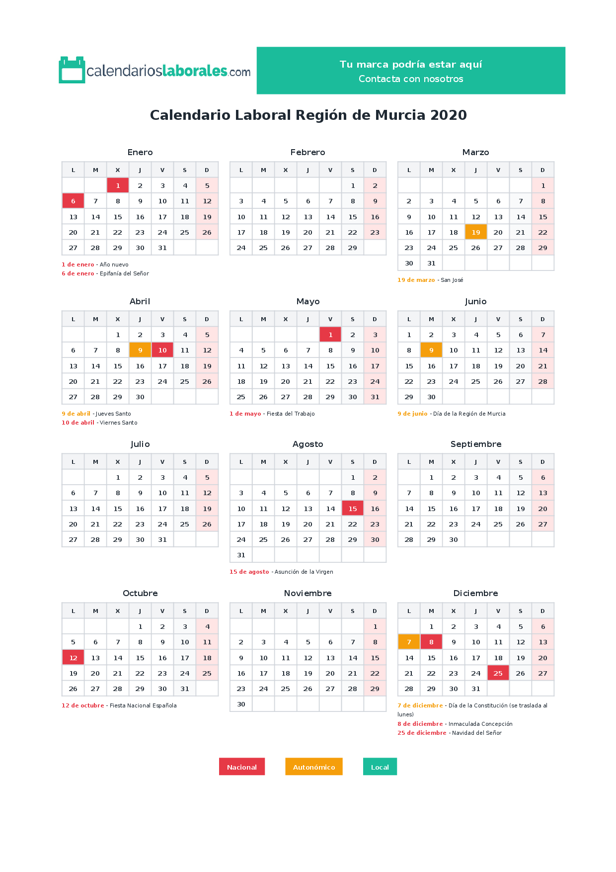 Calendario laboral Región de Murcia 2020