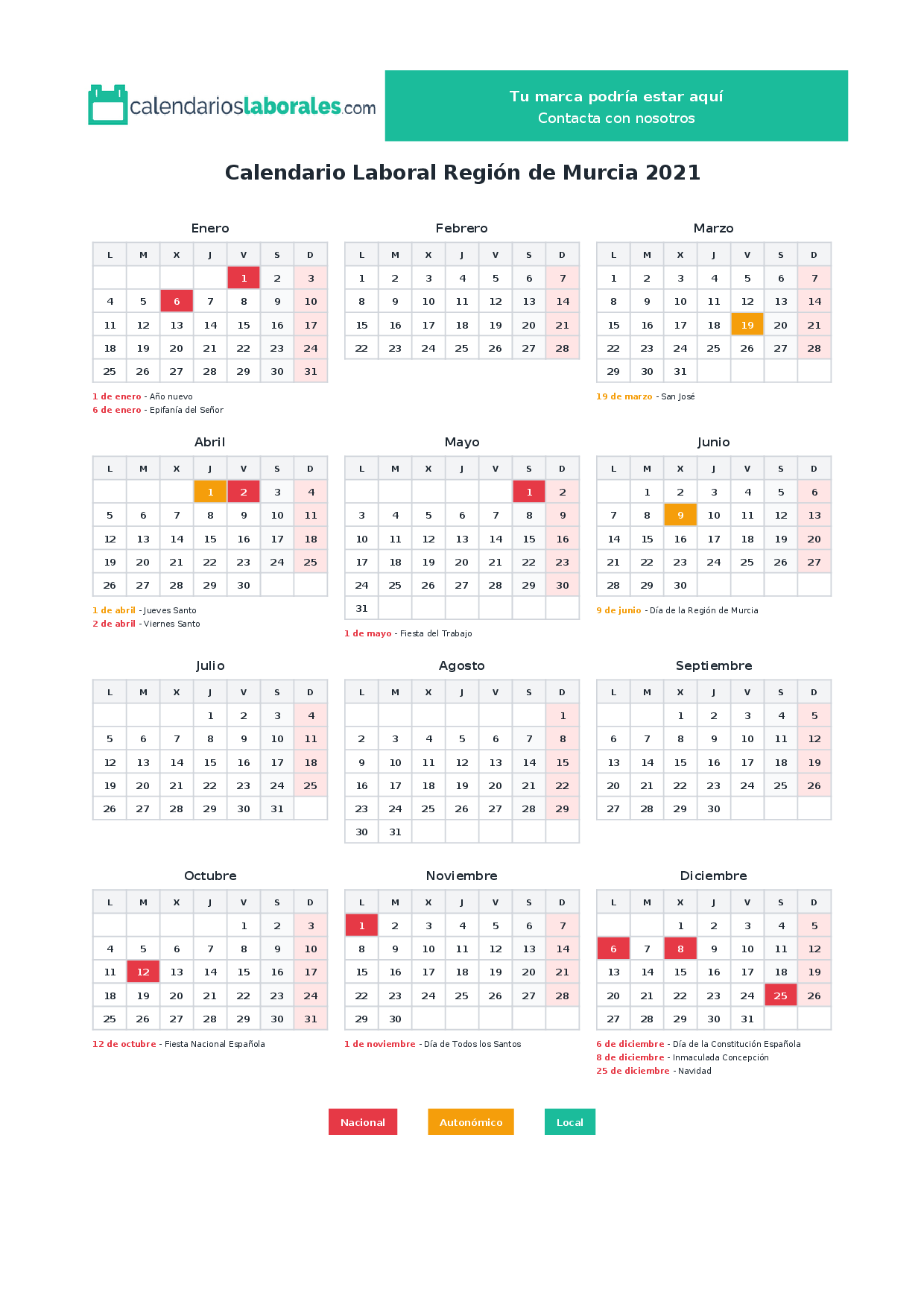 Calendario laboral Región de Murcia 2021