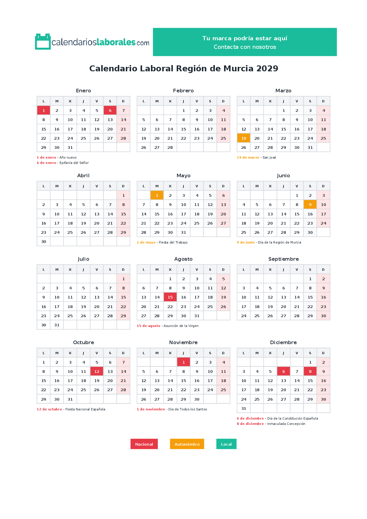 Calendario laboral Región de Murcia 2029
