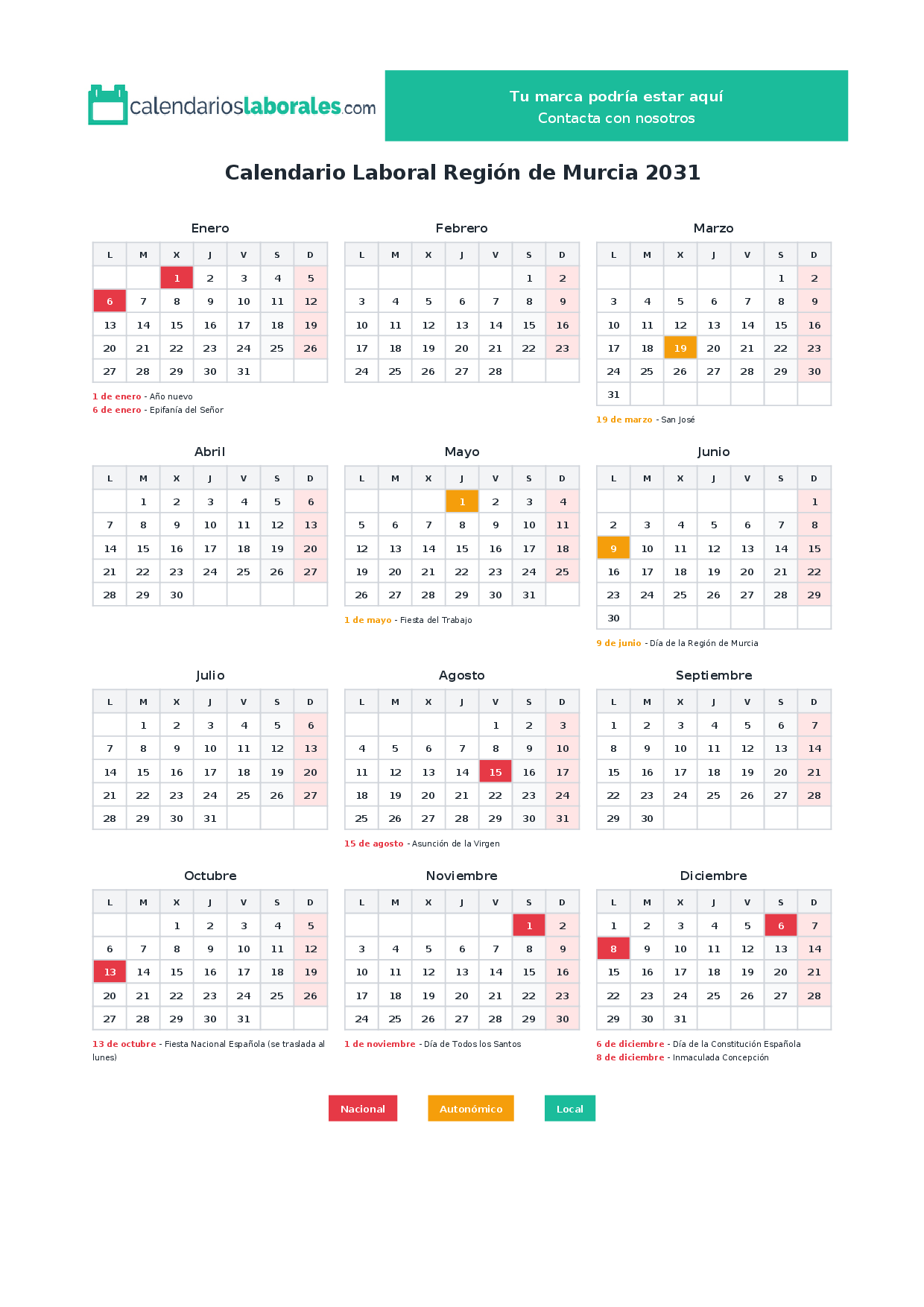 Calendario laboral Región de Murcia 2031