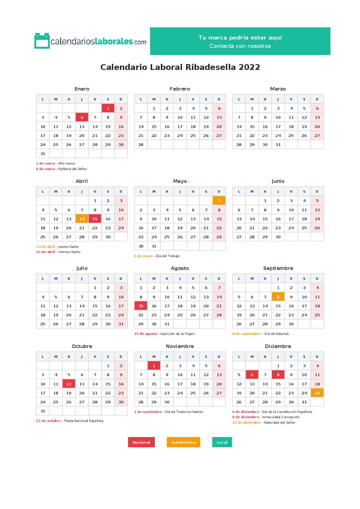 Calendario laboral Ribadesella 2022