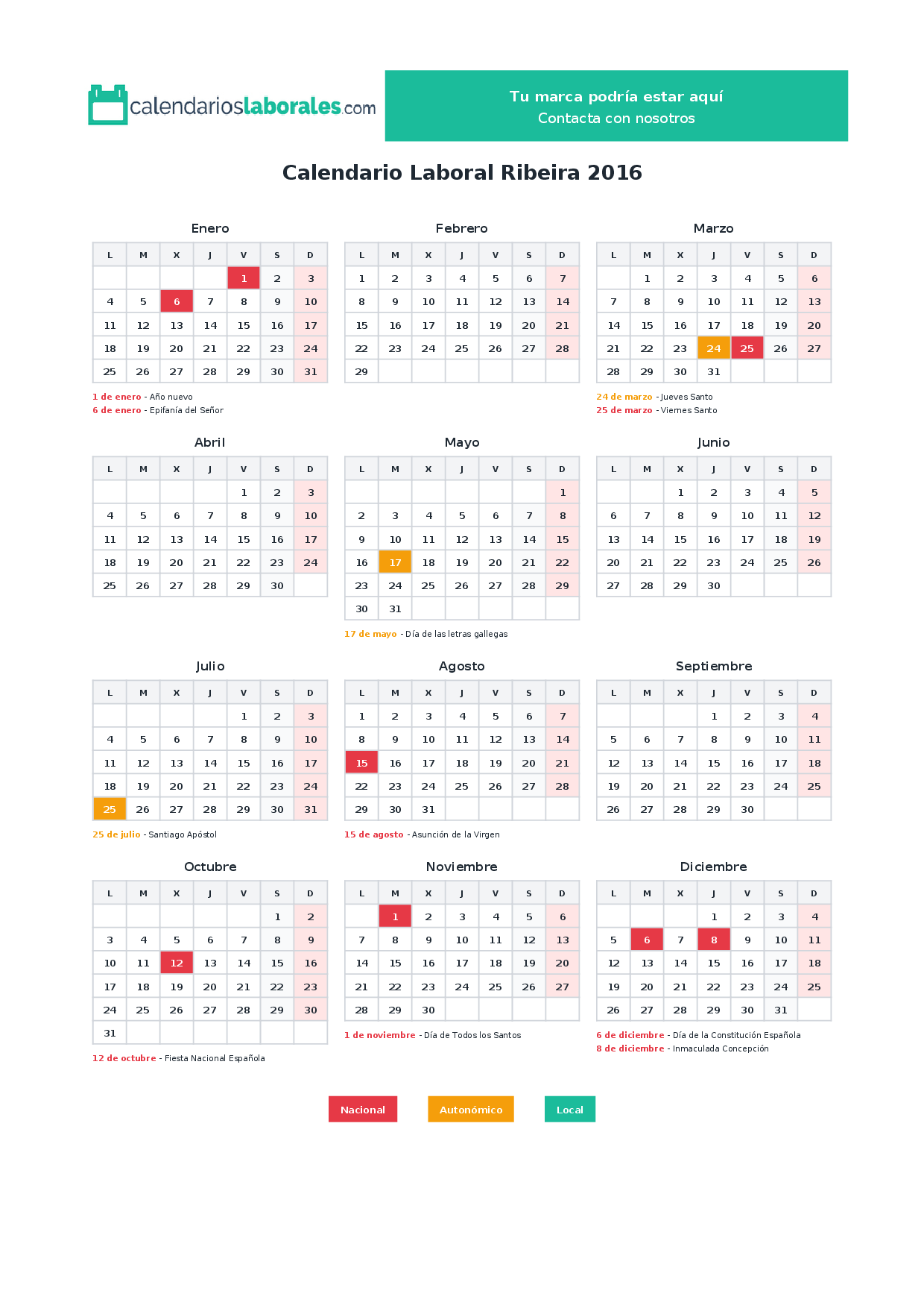 El calendario laboral de Ribeira en 2016 incluye un total de 11 días festivos, que combinan festivos nacionales, festivos autonómicos de Galicia y los festivos locales propios del municipio.