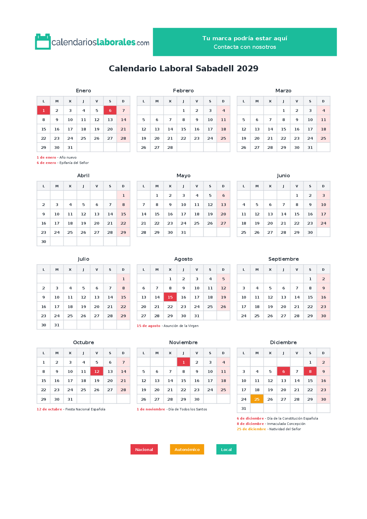 El calendario laboral de Sabadell en 2029 incluye un total de 8 días festivos, que combinan festivos nacionales, festivos autonómicos de Cataluña y los festivos locales propios del municipio.