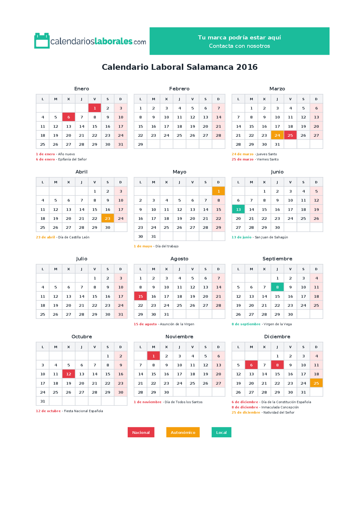 El calendario laboral de Salamanca en 2016 cuenta con un total de 14 días festivos, que incluyen festivos nacionales, festivos autonómicos de Castilla León y los festivos locales establecidos por cada municipio.