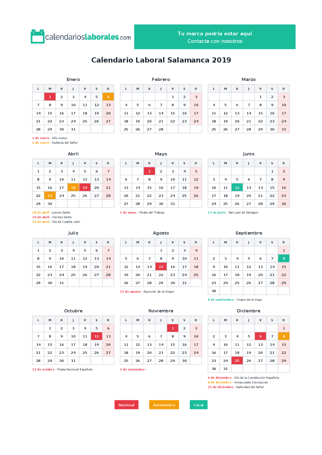 El calendario laboral de Salamanca en 2019 cuenta con un total de 14 días festivos, que incluyen festivos nacionales, festivos autonómicos de Castilla León y los festivos locales establecidos por cada municipio.