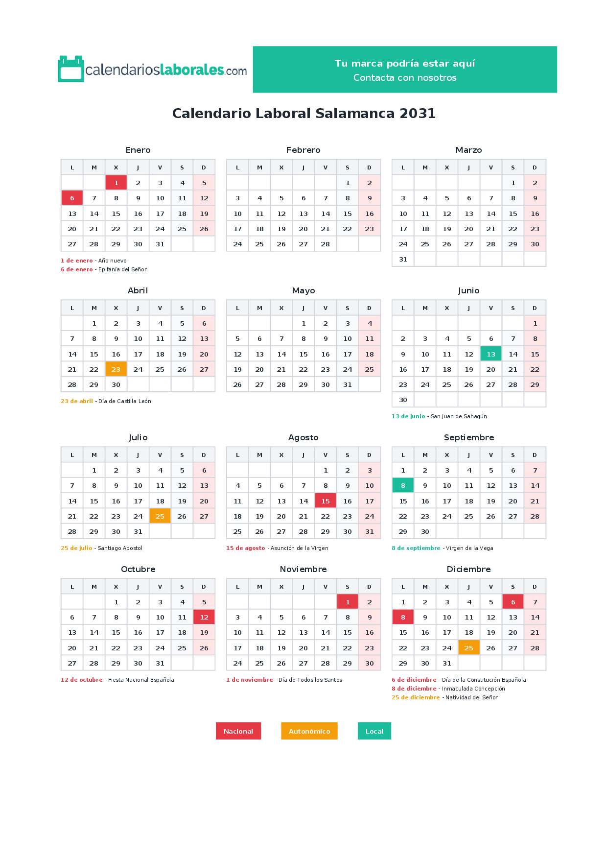 El calendario laboral de Salamanca en 2031 cuenta con un total de 12 días festivos, que incluyen festivos nacionales, festivos autonómicos de Castilla León y los festivos locales establecidos por cada municipio.