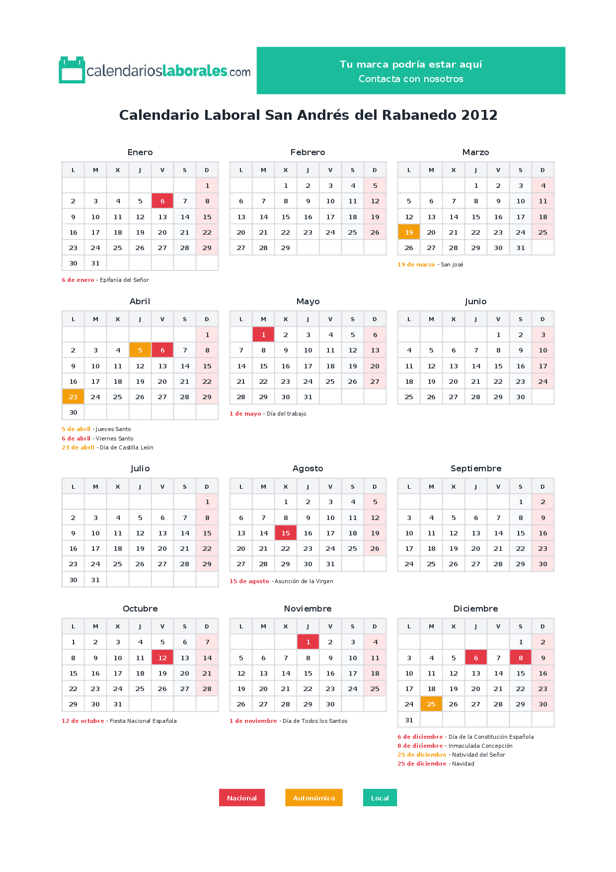 En 2012, 9 festivos nacionales se celebran en todo el territorio español, incluidos en el calendario laboral de San Andrés del Rabanedo.