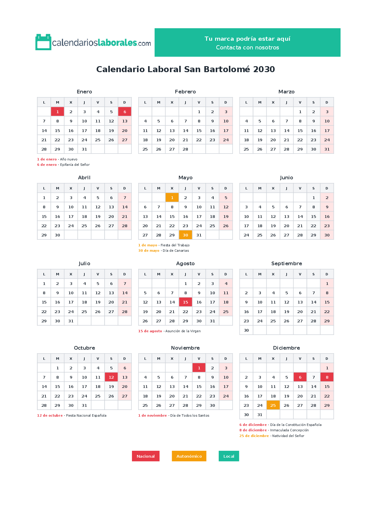 El calendario laboral de San Bartolomé en 2030 incluye un total de 10 días festivos, que combinan festivos nacionales, festivos autonómicos de Canarias y los festivos locales propios del municipio.