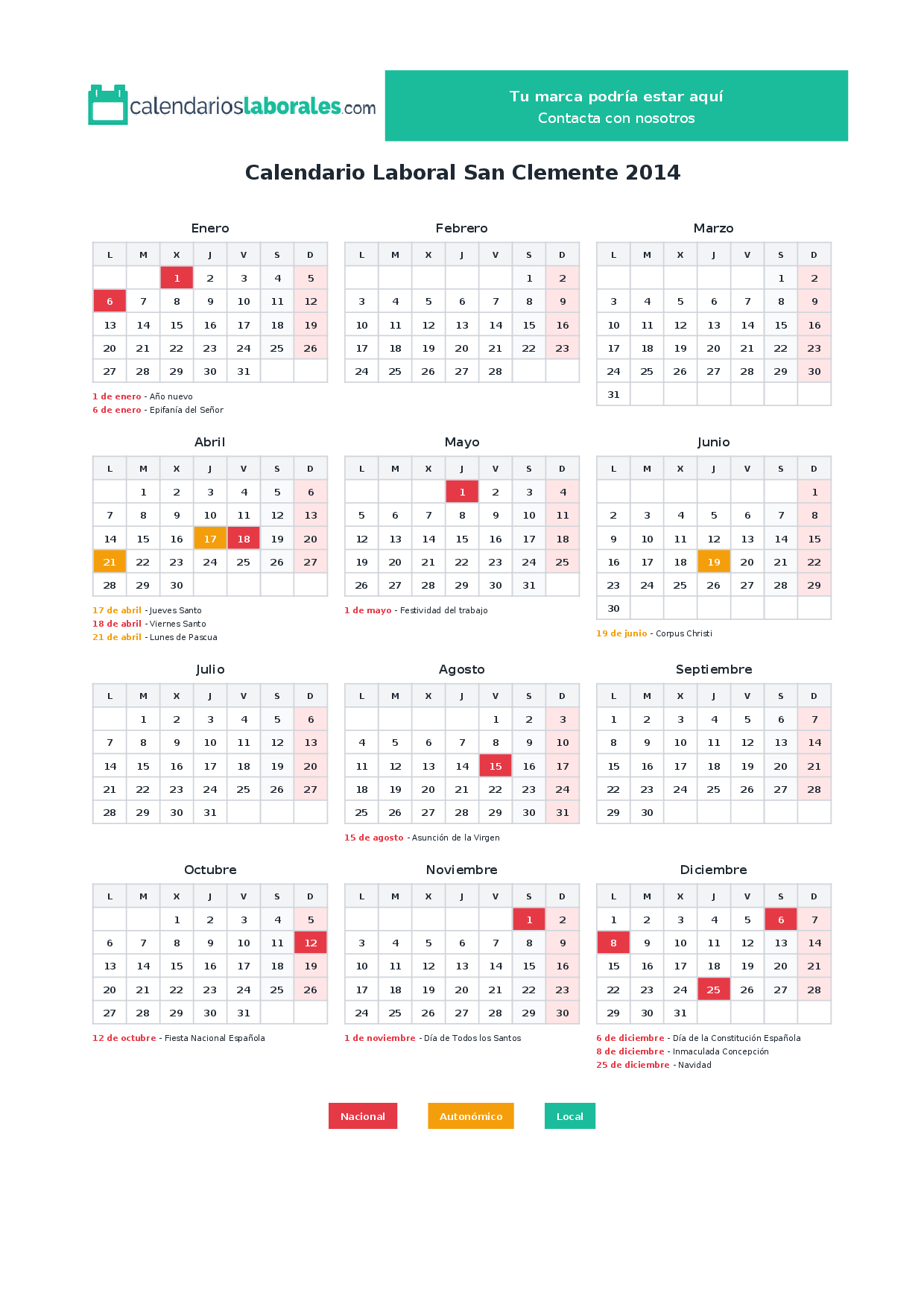 En 2014, 10 festivos nacionales se celebran en todo el territorio español, incluidos en el calendario laboral de San Clemente.