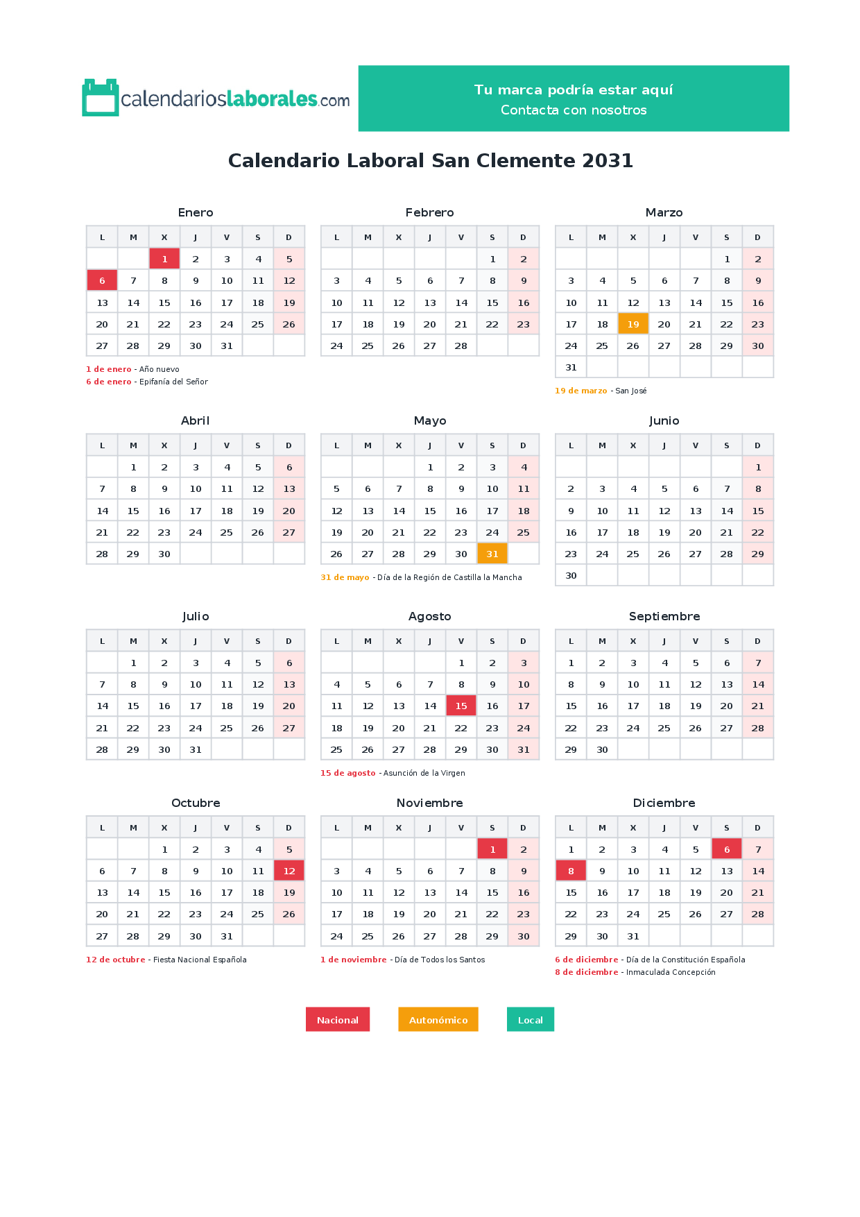 Calendario laboral San Clemente 2031