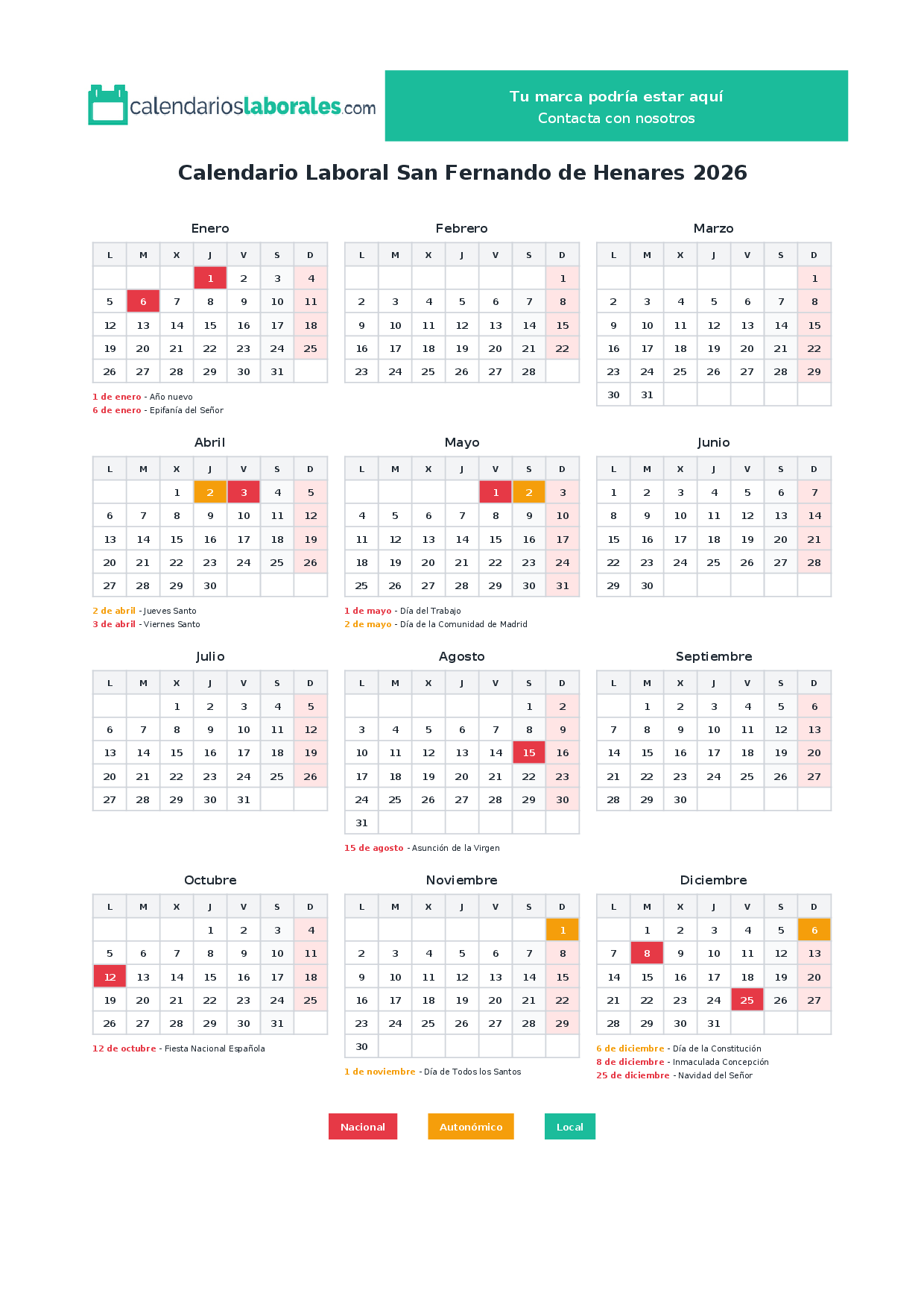 Además, el Ayuntamiento de San Fernando de Henares fija 0 festivos locales que completan el calendario laboral del municipio.