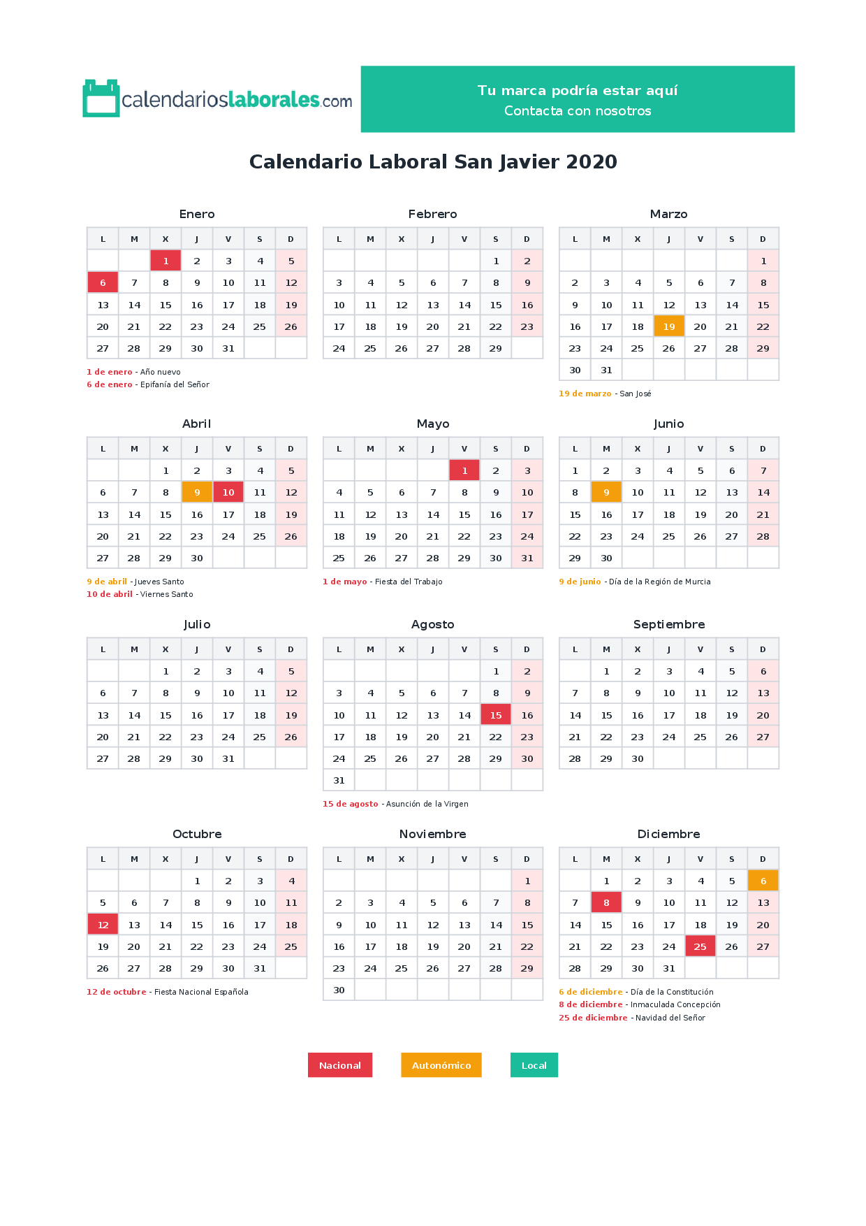 Calendario laboral San Javier 2020