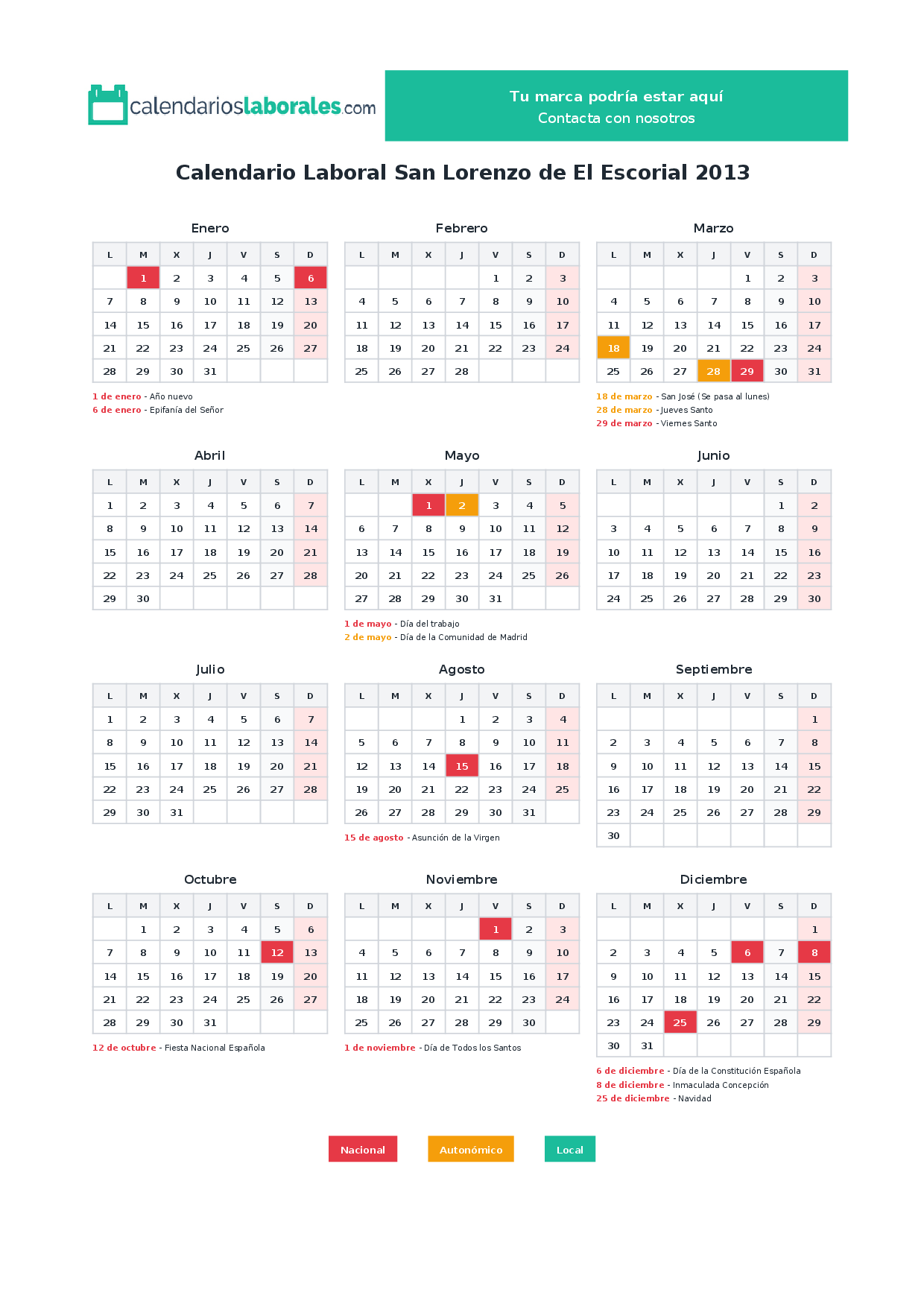 En 2013, 10 festivos nacionales se celebran en todo el territorio español, incluidos en el calendario laboral de San Lorenzo de El Escorial.