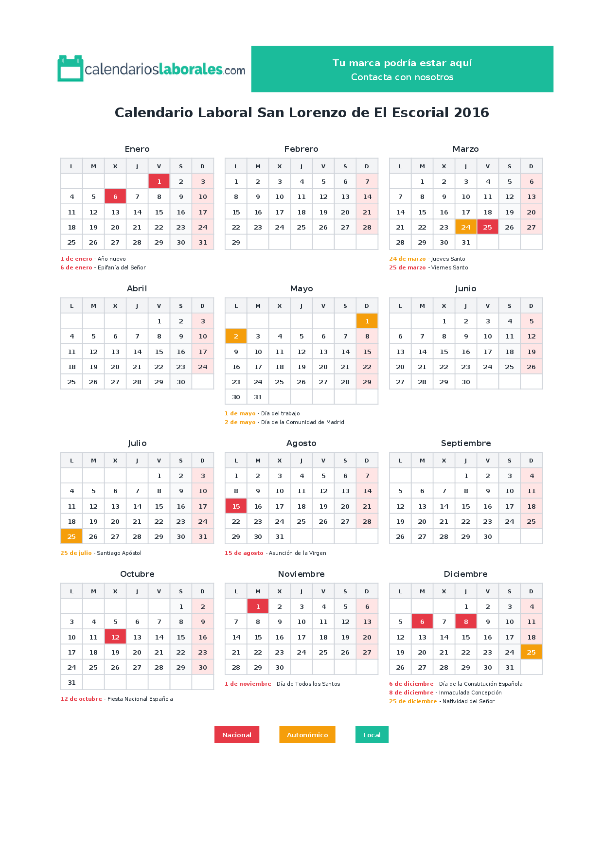 En 2016, 8 festivos nacionales se celebran en todo el territorio español, incluidos en el calendario laboral de San Lorenzo de El Escorial.