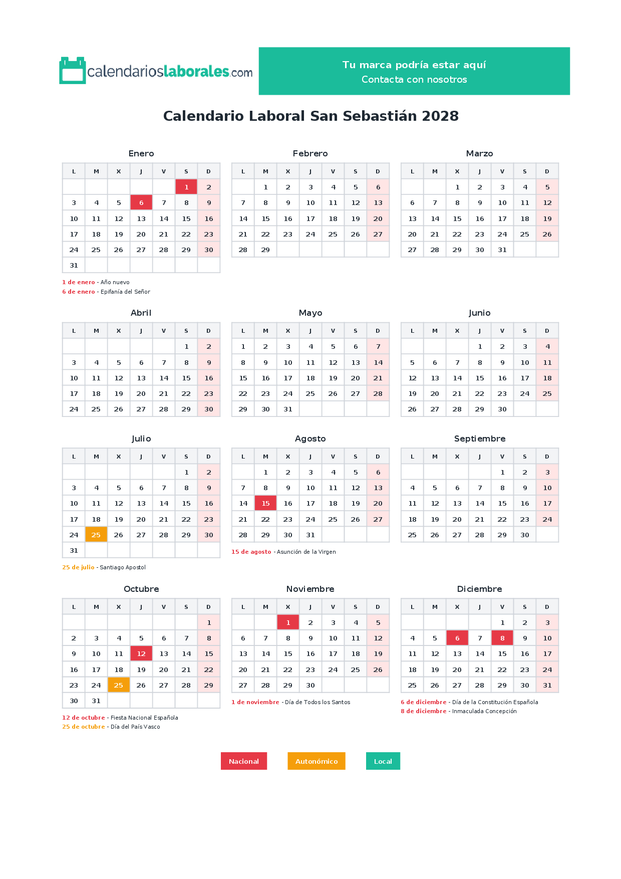 El calendario laboral de San Sebastián en 2028 incluye un total de 9 días festivos, que combinan festivos nacionales, festivos autonómicos de País Vasco y los festivos locales propios del municipio.