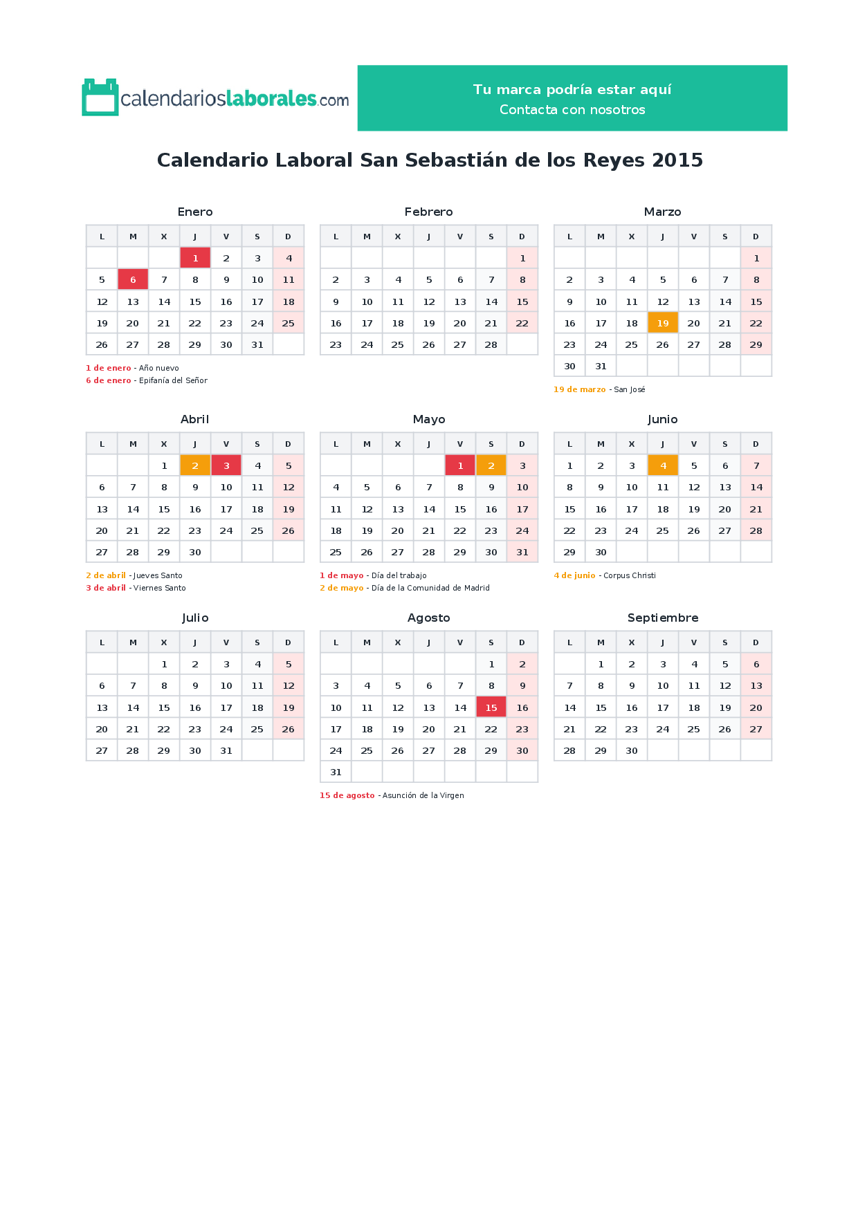 En 2015, 20 festivos nacionales se celebran en todo el territorio español, incluidos en el calendario laboral de San Sebastián de los Reyes.