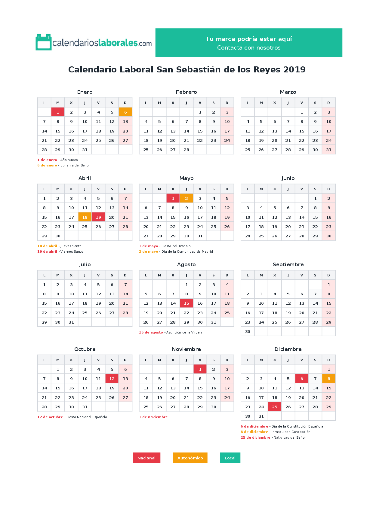 En 2019, 8 festivos nacionales se celebran en todo el territorio español, incluidos en el calendario laboral de San Sebastián de los Reyes.