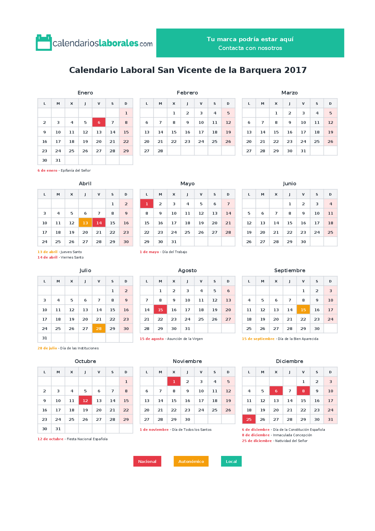 En 2017, 9 festivos nacionales se celebran en todo el territorio español, incluidos en el calendario laboral de San Vicente de la Barquera.