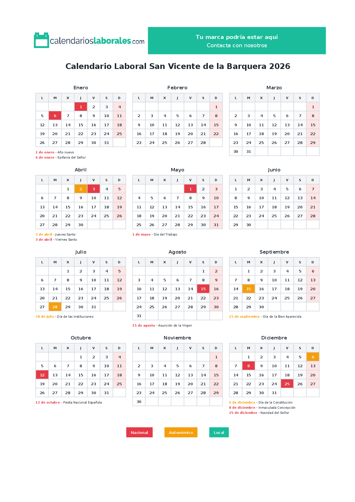 Además, el Ayuntamiento de San Vicente de la Barquera fija 0 festivos locales que completan el calendario laboral del municipio.