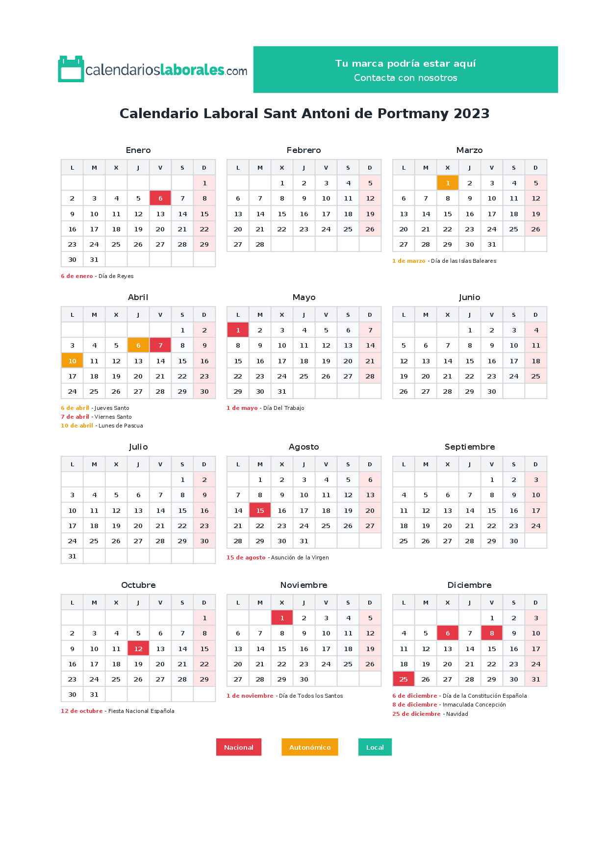 Calendario laboral Sant Antoni de Portmany 2023