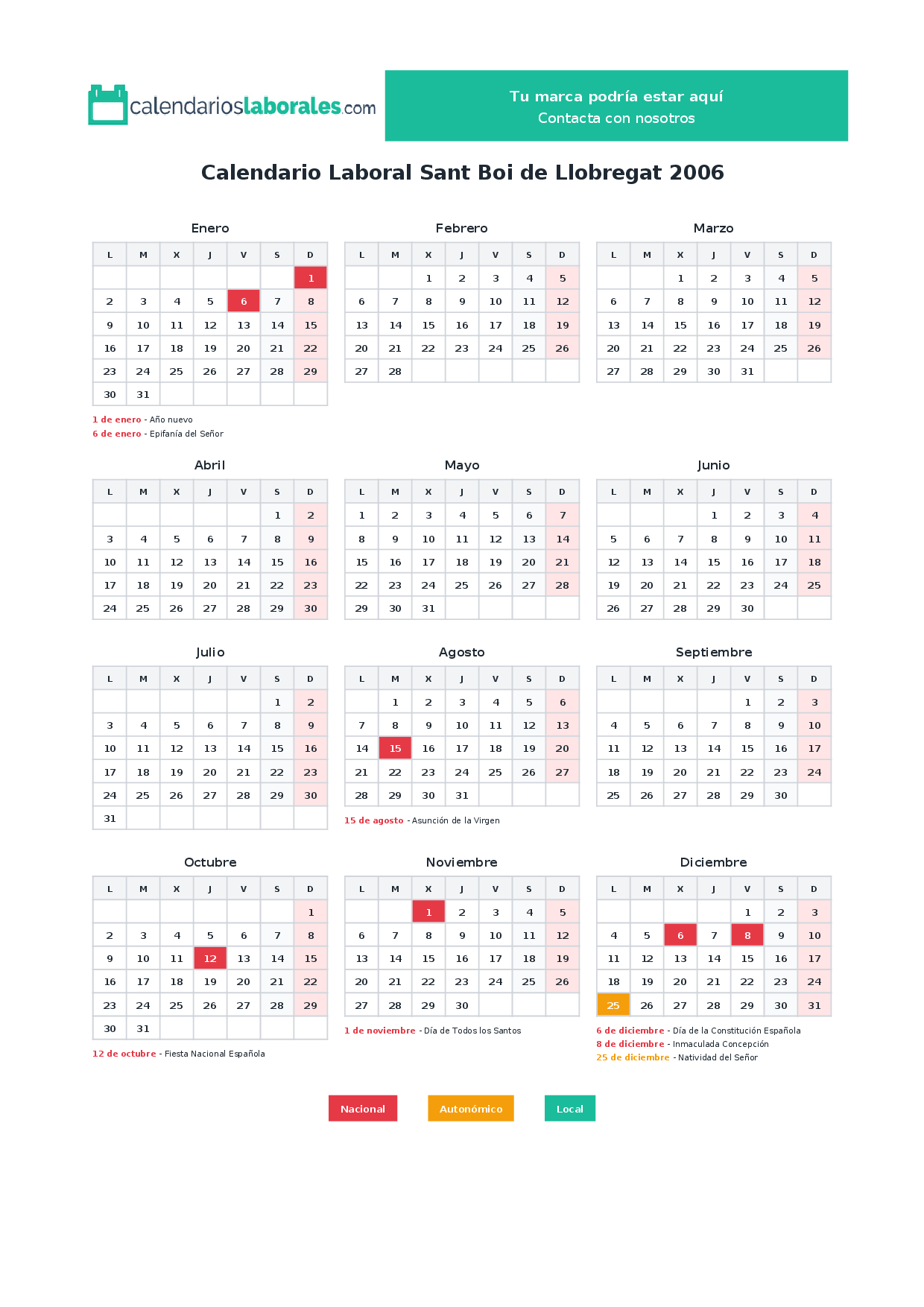 En 2006, 7 festivos nacionales se celebran en todo el territorio español, incluidos en el calendario laboral de Sant Boi de Llobregat.