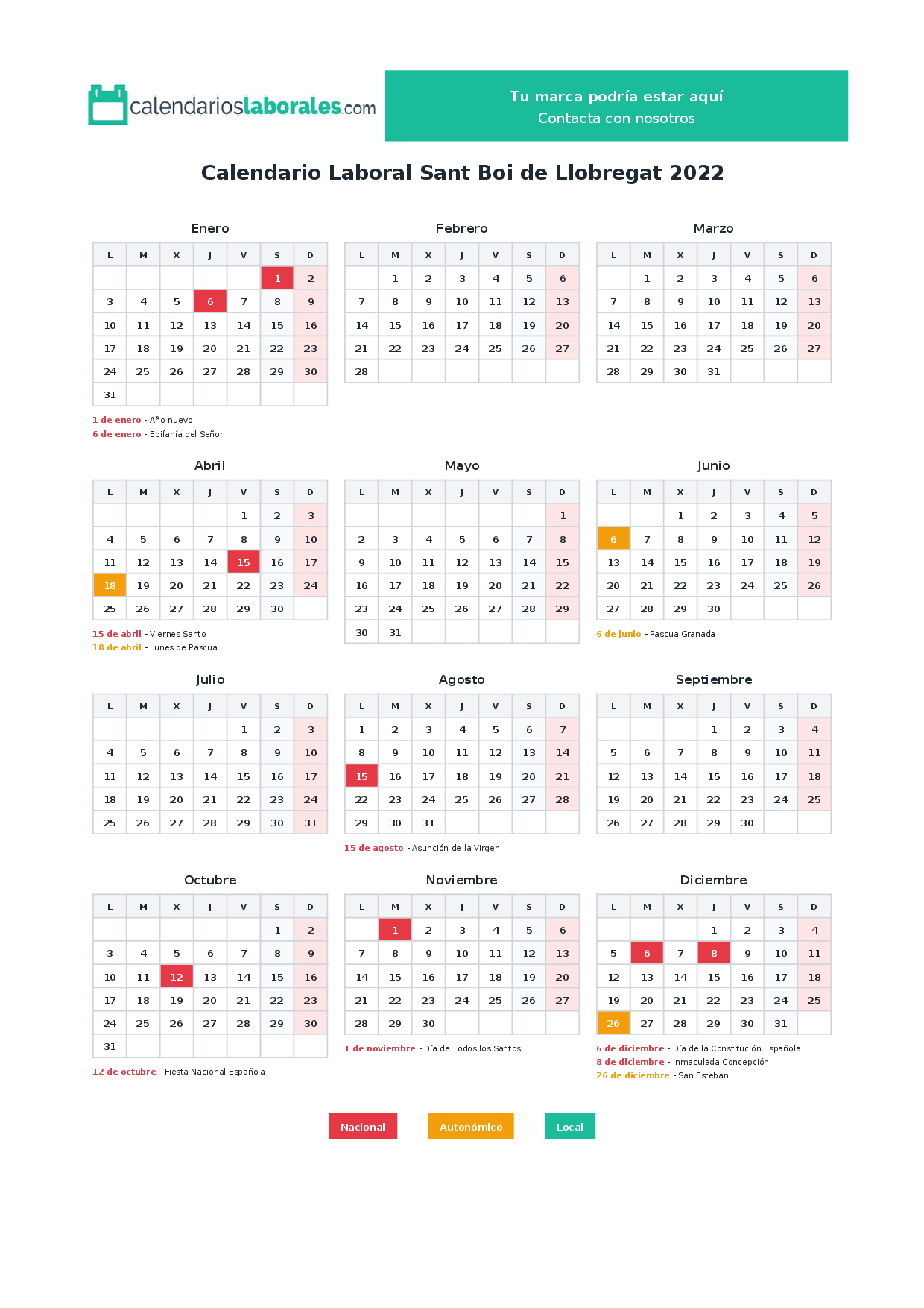 En 2022, 8 festivos nacionales se celebran en todo el territorio español, incluidos en el calendario laboral de Sant Boi de Llobregat.