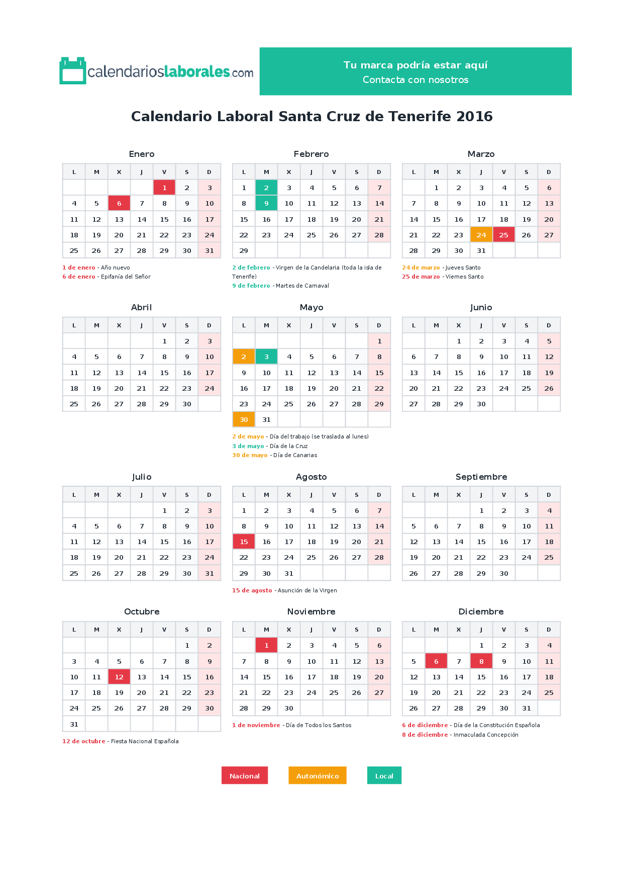 Calendario laboral Santa Cruz de Tenerife 2016