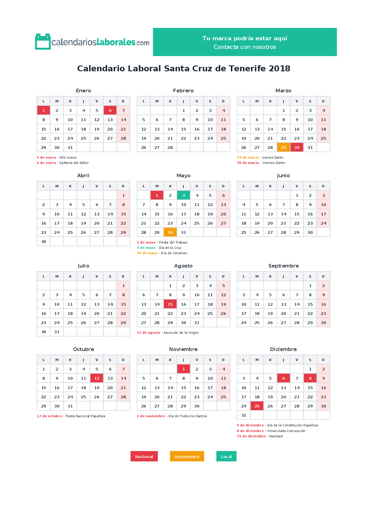 El calendario laboral de Santa Cruz de Tenerife en 2018 cuenta con un total de 13 días festivos, que incluyen festivos nacionales, festivos autonómicos de Canarias y los festivos locales establecidos por cada municipio.