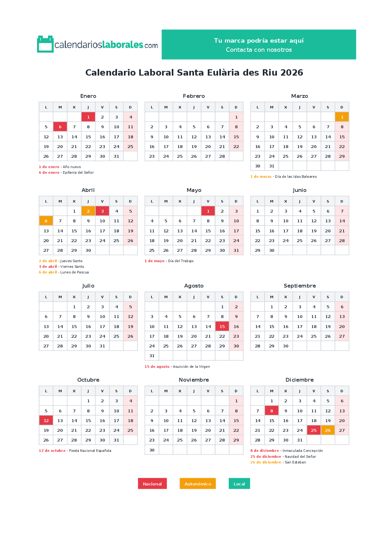 El calendario laboral de Santa Eulària des Riu en 2026 incluye un total de 12 días festivos, que combinan festivos nacionales, festivos autonómicos de Baleares y los festivos locales propios del municipio.