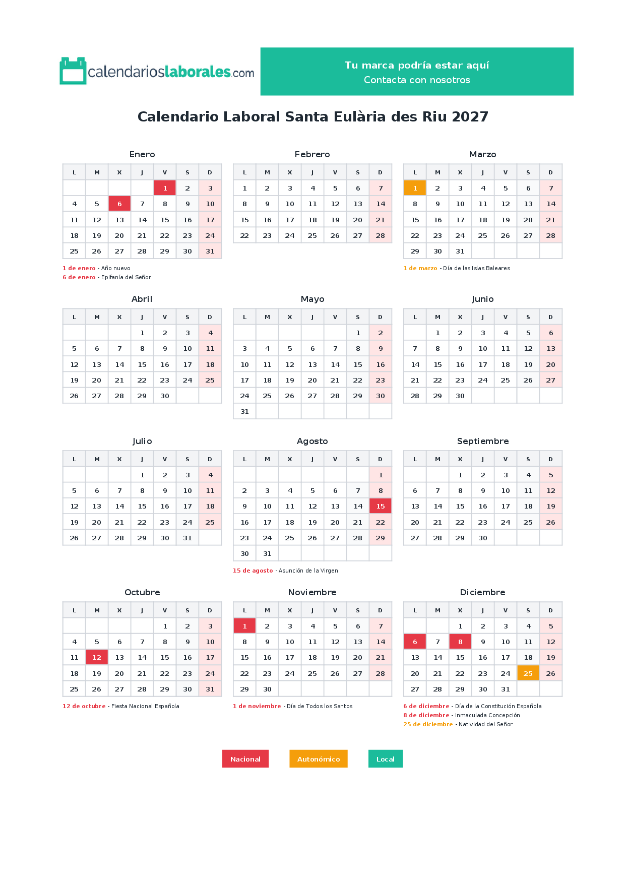 Calendario laboral Santa Eulària des Riu 2027