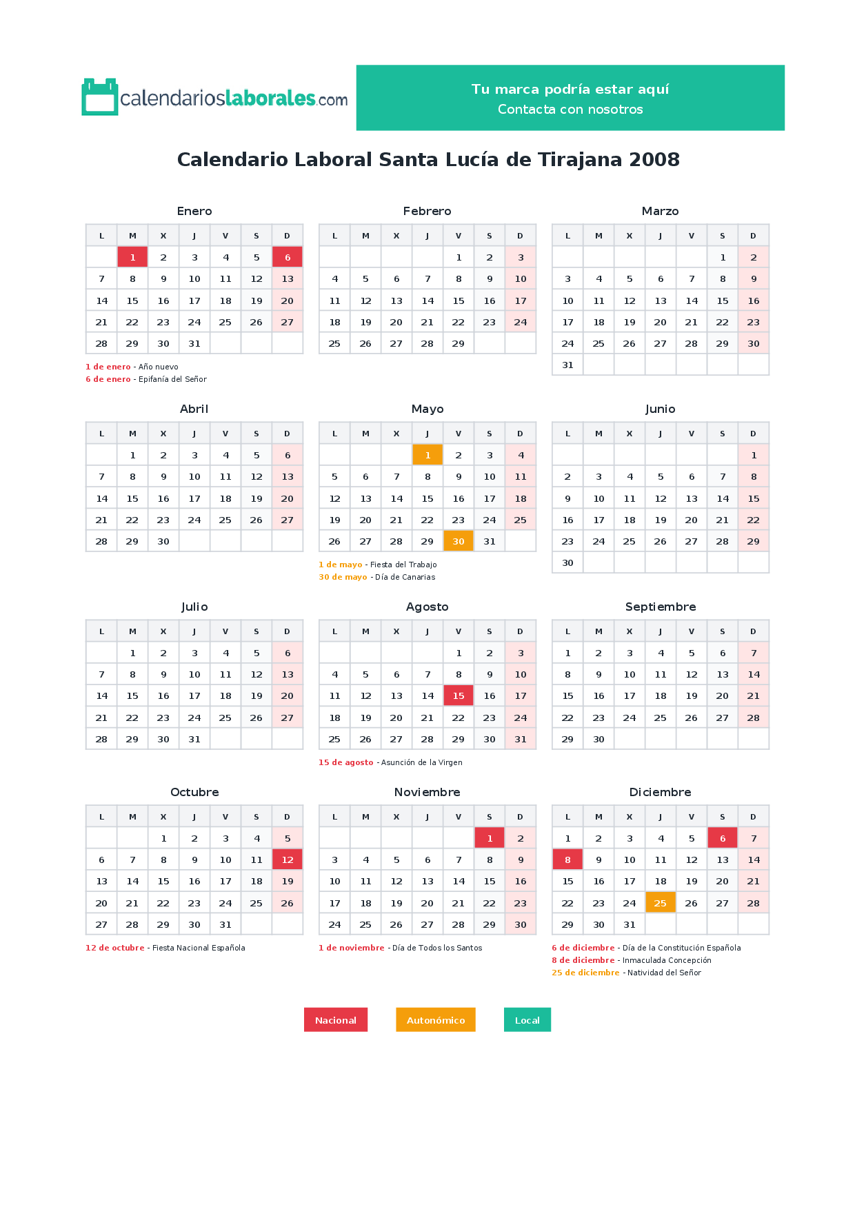 En 2008, 7 festivos nacionales se celebran en todo el territorio español, incluidos en el calendario laboral de Santa Lucía de Tirajana.