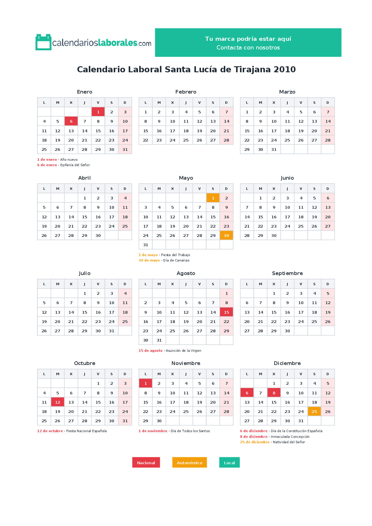 El calendario laboral de Santa Lucía de Tirajana en 2010 incluye un total de 10 días festivos, que combinan festivos nacionales, festivos autonómicos de Canarias y los festivos locales propios del municipio.