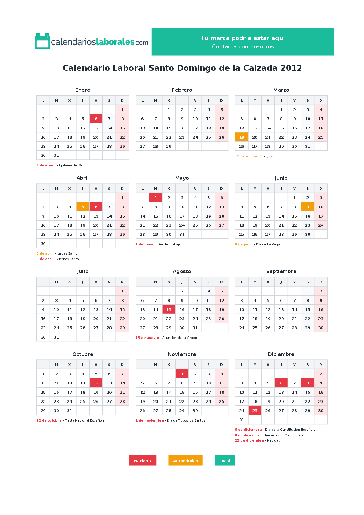 En 2012, 9 festivos nacionales se celebran en todo el territorio español, incluidos en el calendario laboral de Santo Domingo de la Calzada.