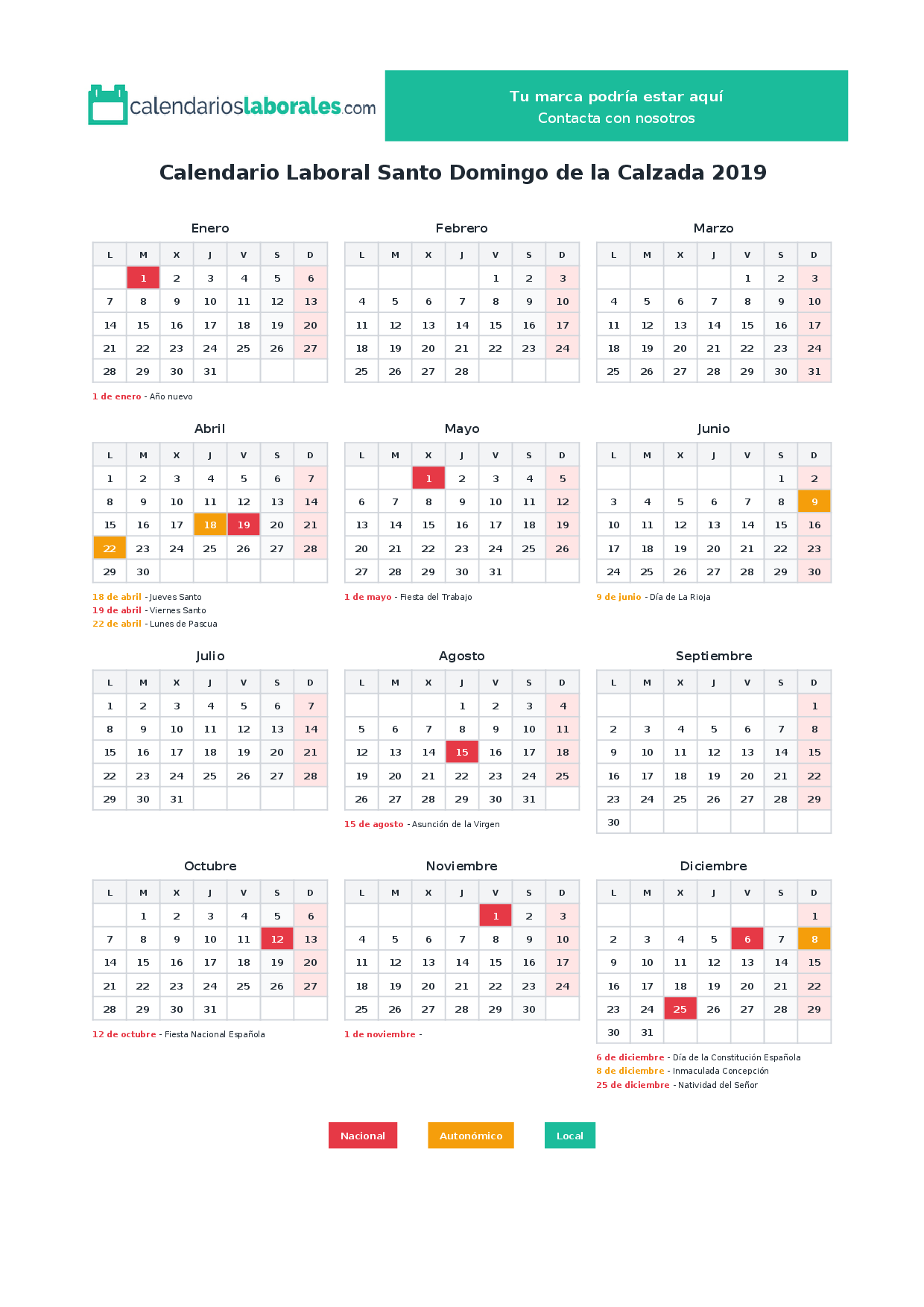 En 2019, 8 festivos nacionales se celebran en todo el territorio español, incluidos en el calendario laboral de Santo Domingo de la Calzada.