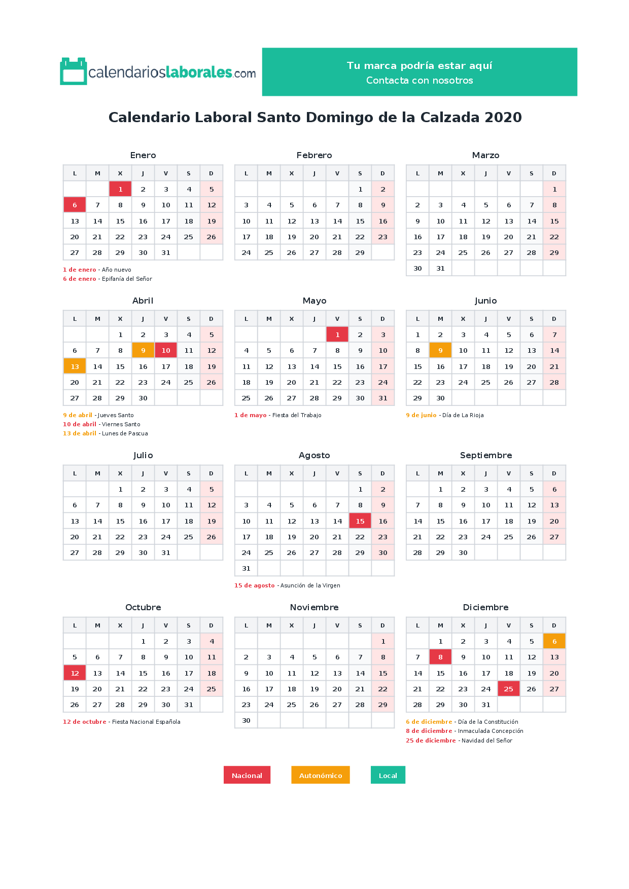 Calendario laboral Santo Domingo de la Calzada 2020