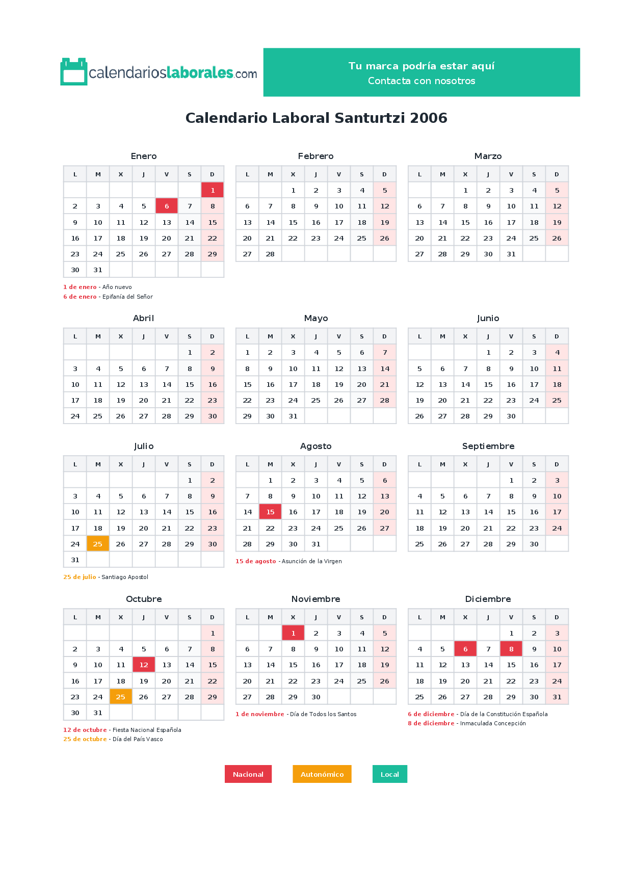 En 2006, 7 festivos nacionales se celebran en todo el territorio español, incluidos en el calendario laboral de Santurtzi.