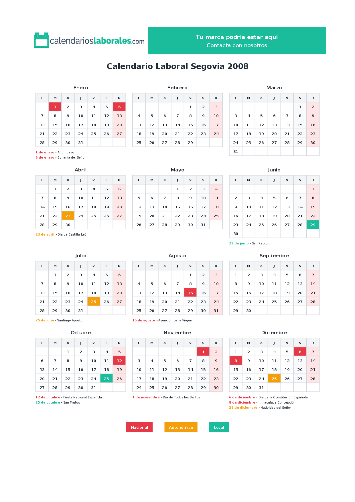 El calendario laboral de Segovia en 2008 cuenta con un total de 12 días festivos, que incluyen festivos nacionales, festivos autonómicos de Castilla León y los festivos locales establecidos por cada municipio.