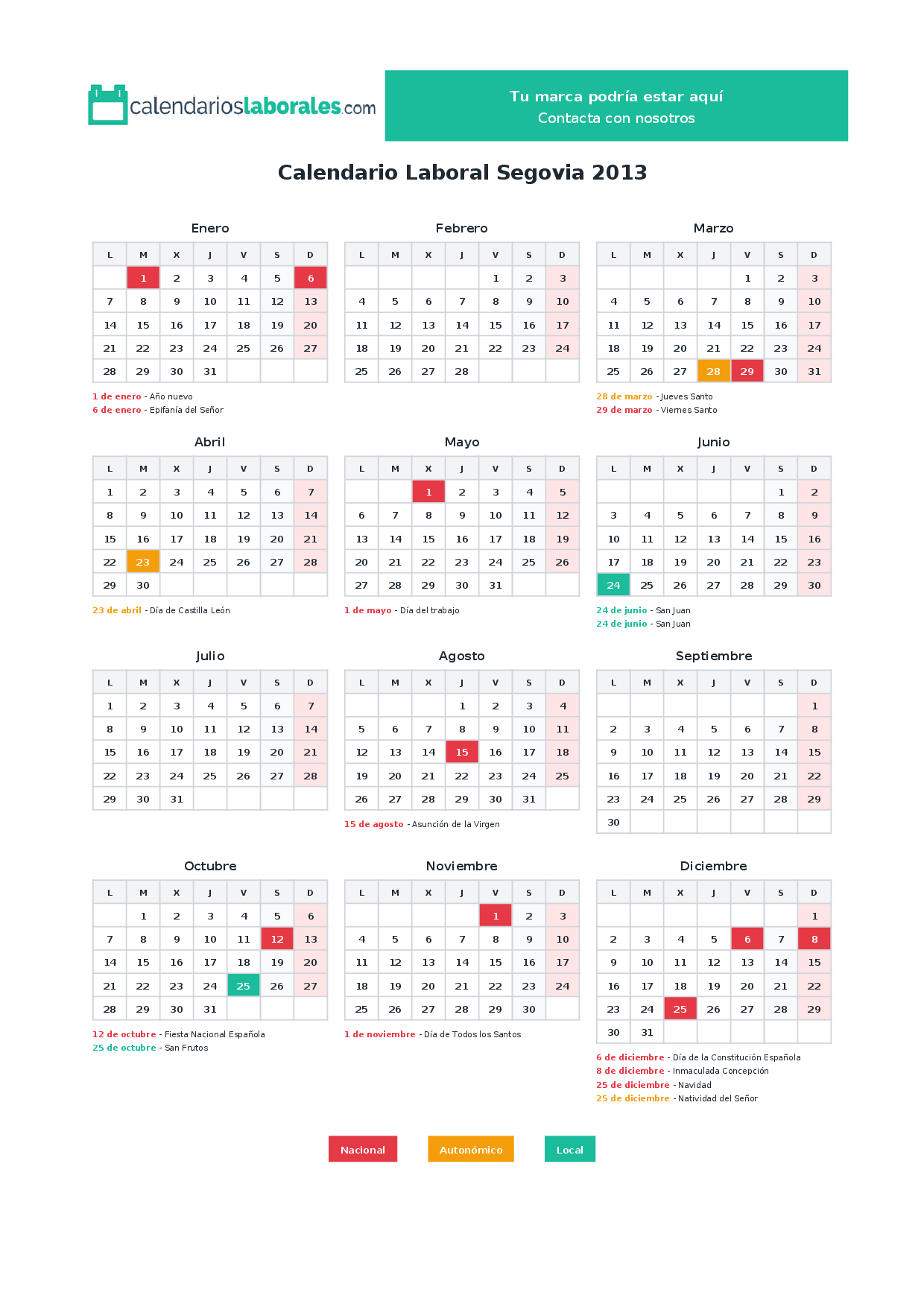 El calendario laboral de Segovia en 2013 cuenta con un total de 14 días festivos, que incluyen festivos nacionales, festivos autonómicos de Castilla León y los festivos locales establecidos por cada municipio.