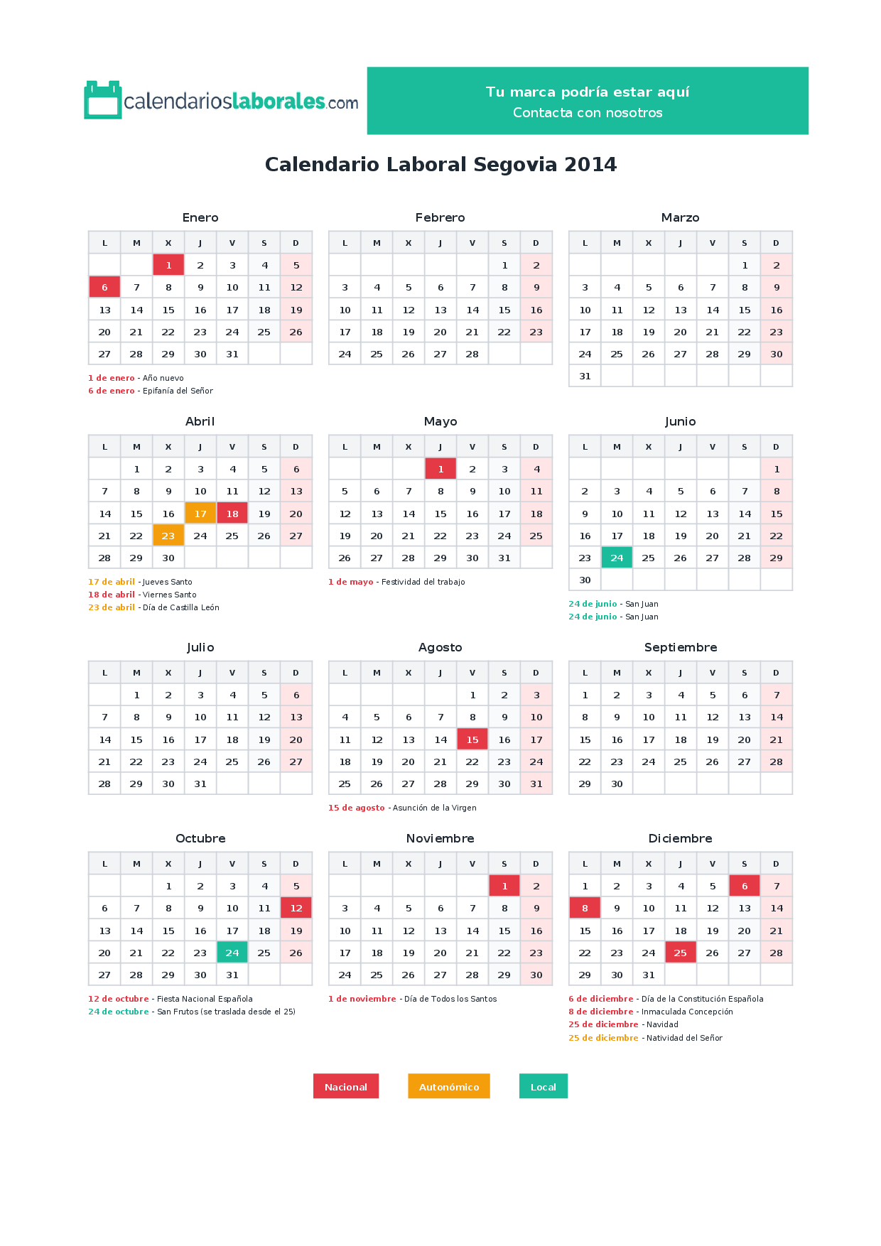El calendario laboral de Segovia en 2014 cuenta con un total de 14 días festivos, que incluyen festivos nacionales, festivos autonómicos de Castilla León y los festivos locales establecidos por cada municipio.